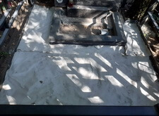 В данном заказе нам предстояло практически полностью преобразить небольшое место захоронения, рассчитанное на пятерых покойных. Клиент решил переделать на могиле практически всё: демонтировать двойной бетонный цветник, заменить ограждение, а также выложить территорию участка гранитной брусчаткой. На фотографии отображено изначальное состояние места захоронения на момент нашего приезда на кладбище.